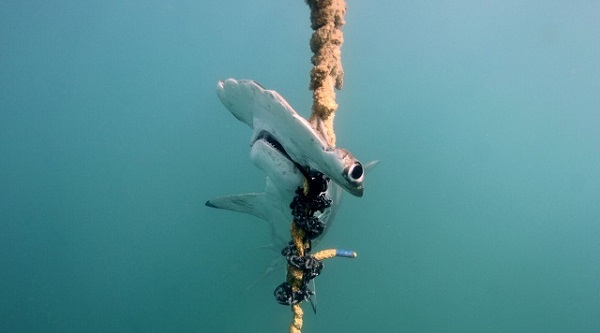 A hammerhead shark on a lethal drumline. Photo courtesy HSI Australia.